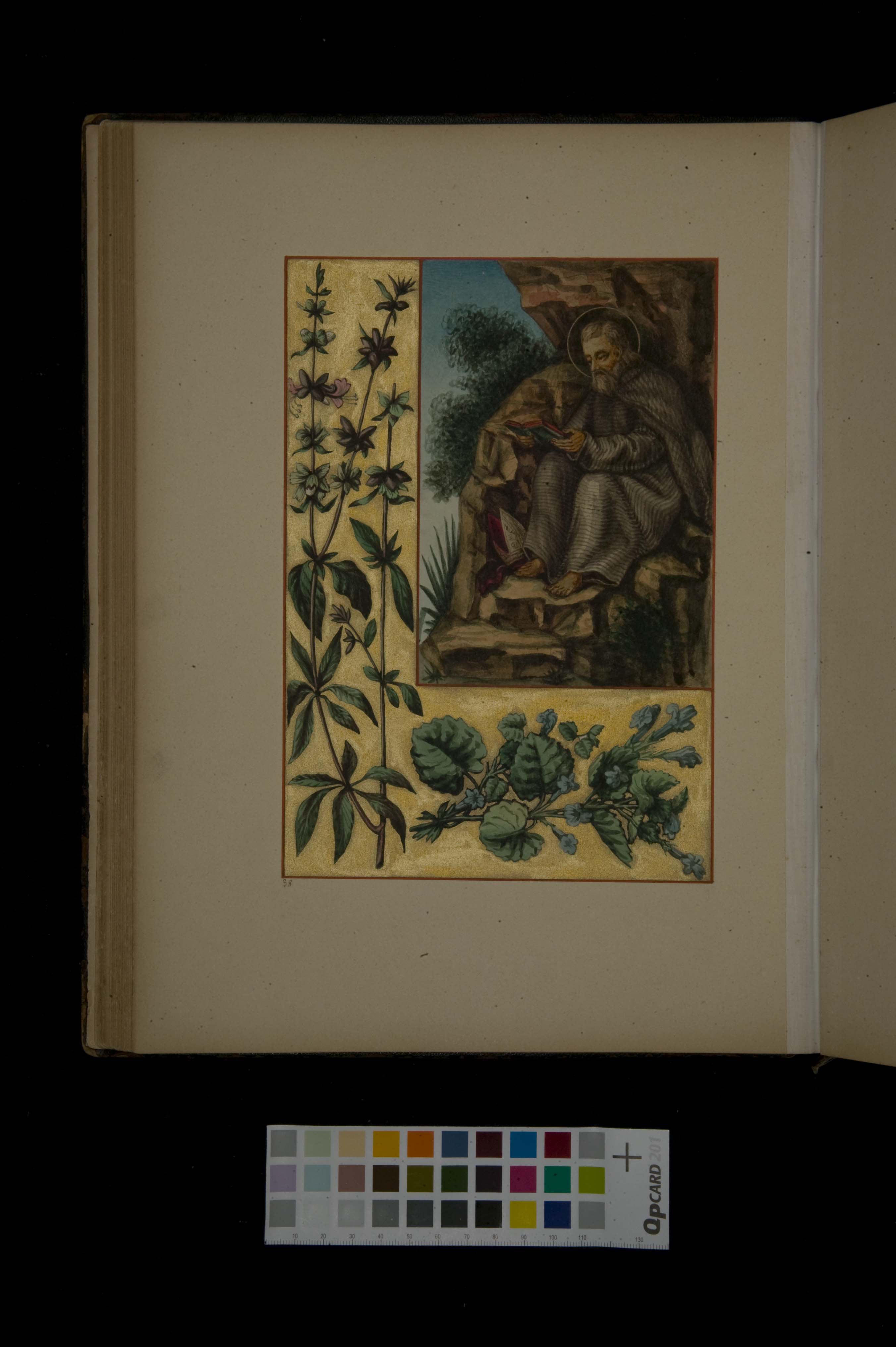 Miniature (full-page) watercolor: Basil sitting on a rock ledge reading a book. Decorated border: Two-sided border decorated with basil. Scanned page of the 1887 Weckerlin illuminated manuscript housed at Mount St. Scholastica, a Benedictine convent in Atchinson Kansas.