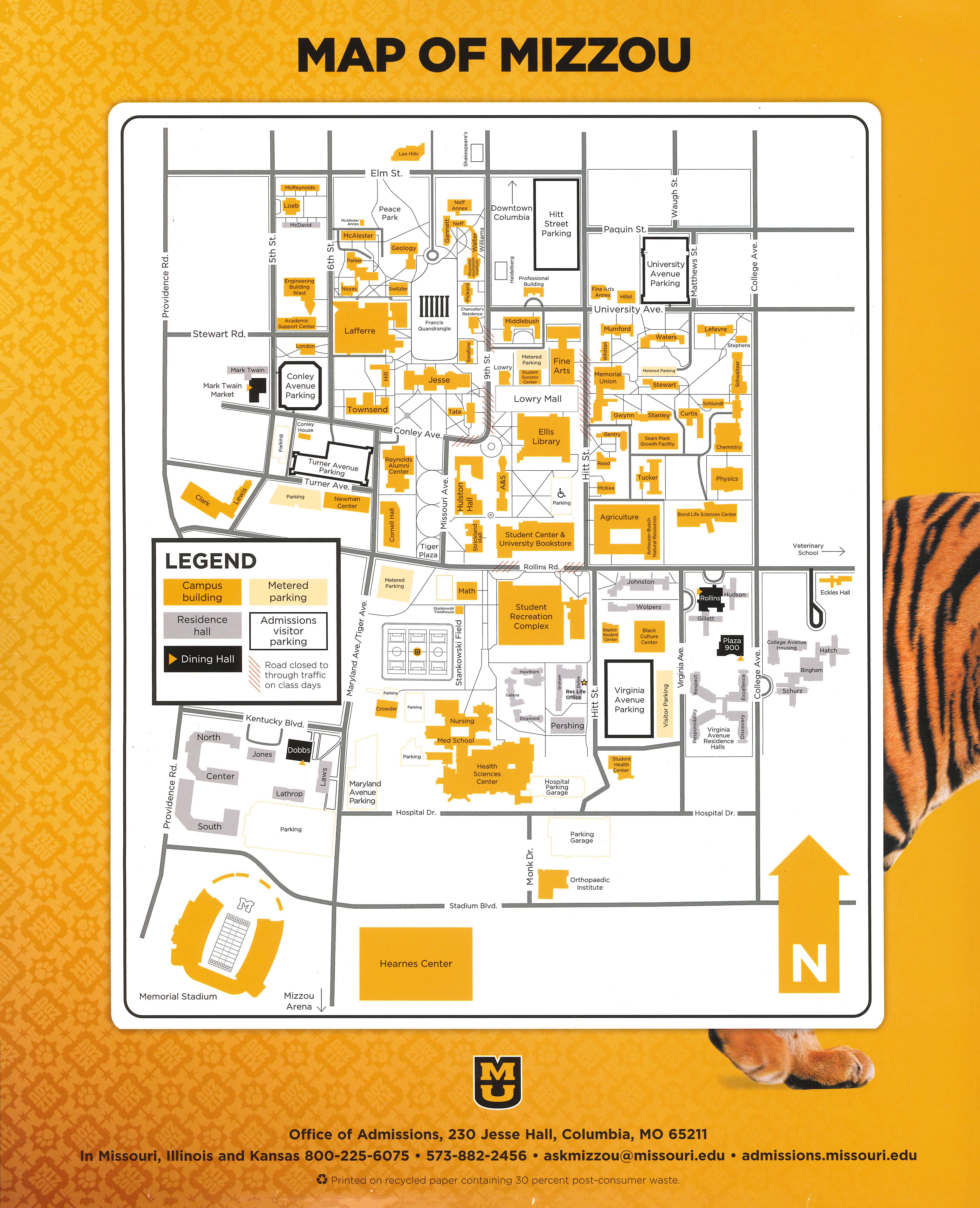 This map appears on the back of a "Mizzou Means More" folder. The map depicts the locations of parking, buildings, dining options, and more on the University of Missouri campus.