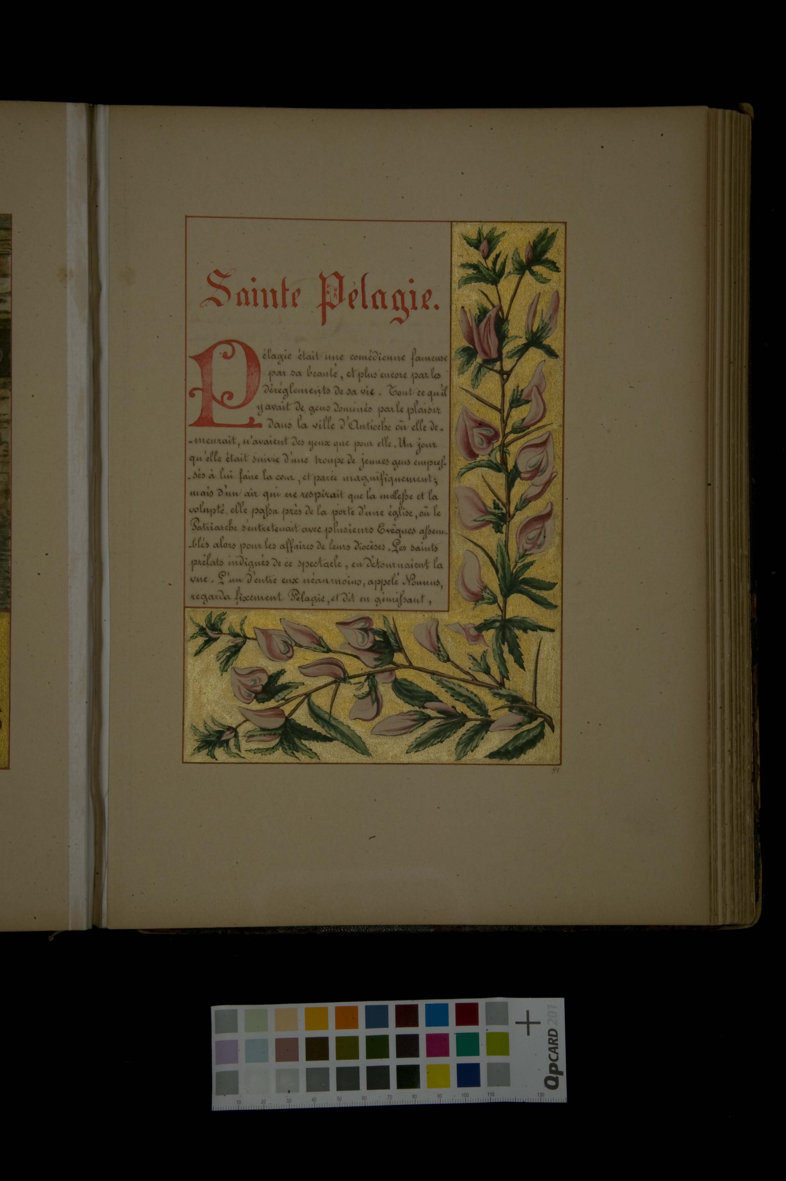 Decorated border: Two-sided border decorated with pink and white flowers. Scanned page of the 1887 Weckerlin illuminated manuscript housed at Mount St. Scholastica, a Benedictine convent in Atchinson Kansas.