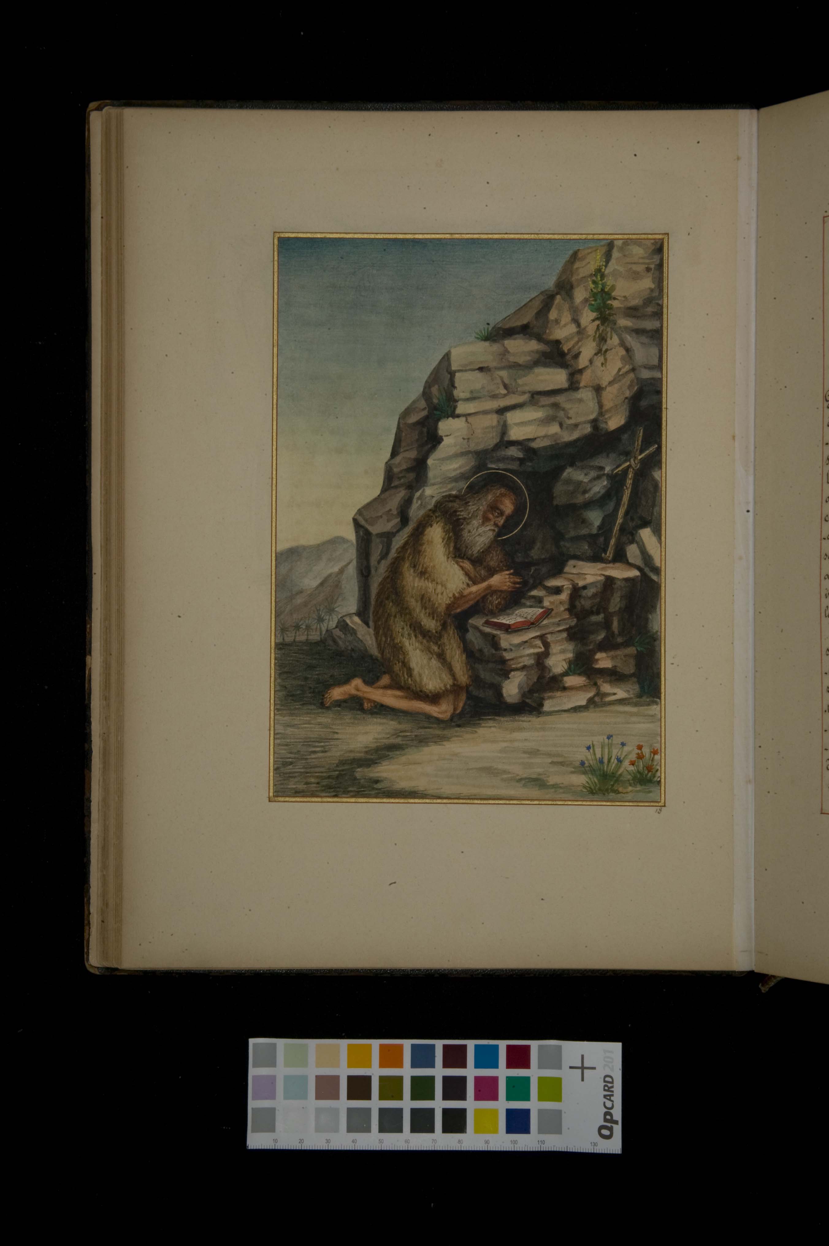 Miniature (full-page) watercolor: Hilarion sitting outside a cave, praying before a book and cross. Scanned page of the 1887 Weckerlin illuminated manuscript housed at Mount St. Scholastica, a Benedictine convent in Atchinson Kansas.