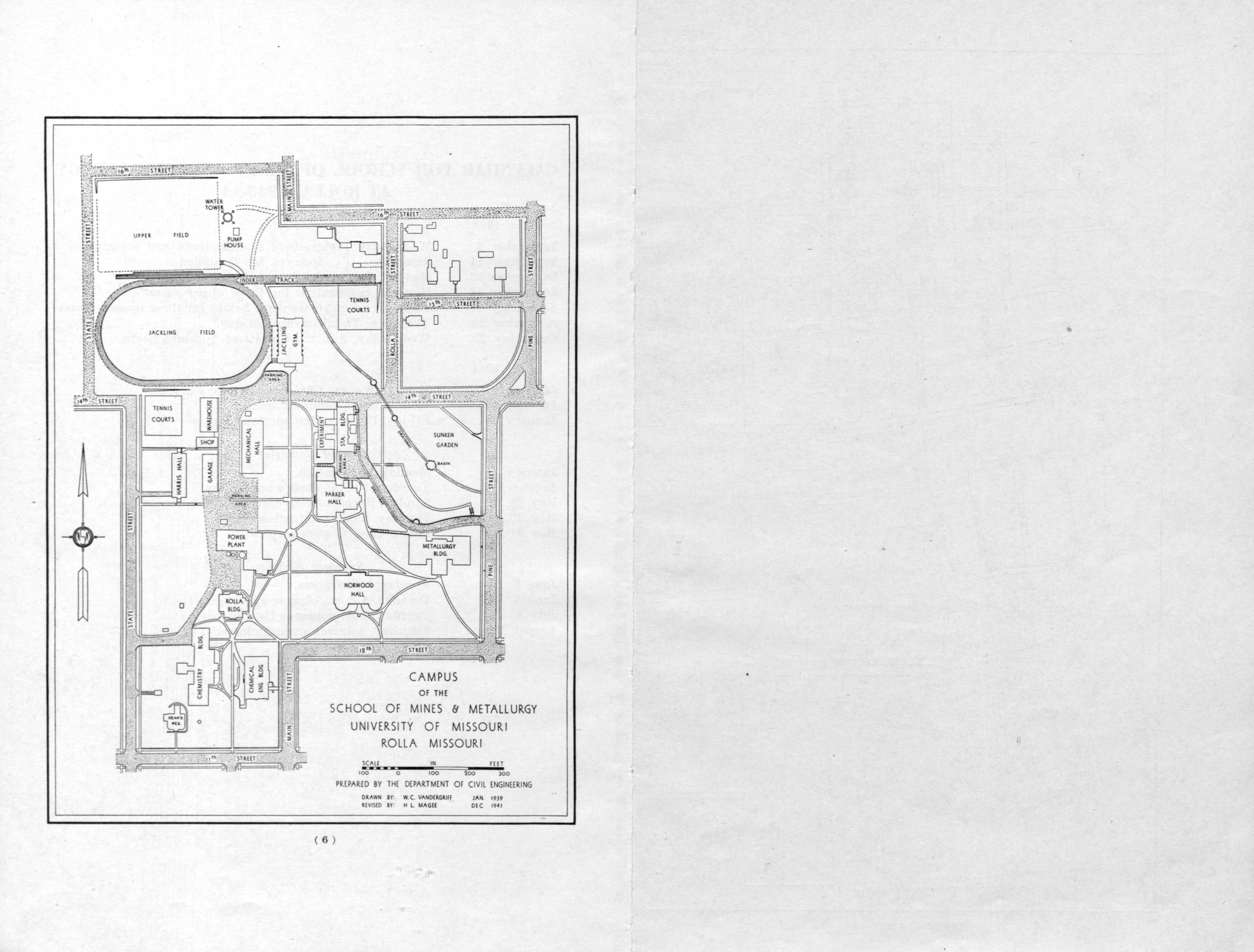 This map shows the locations of buildings on the University of Missouri campus, labeled by number. On the reverse appears a map showing the campus of the School of Mines and Metallurgy, University of Missouri, Rolla, Missouri.