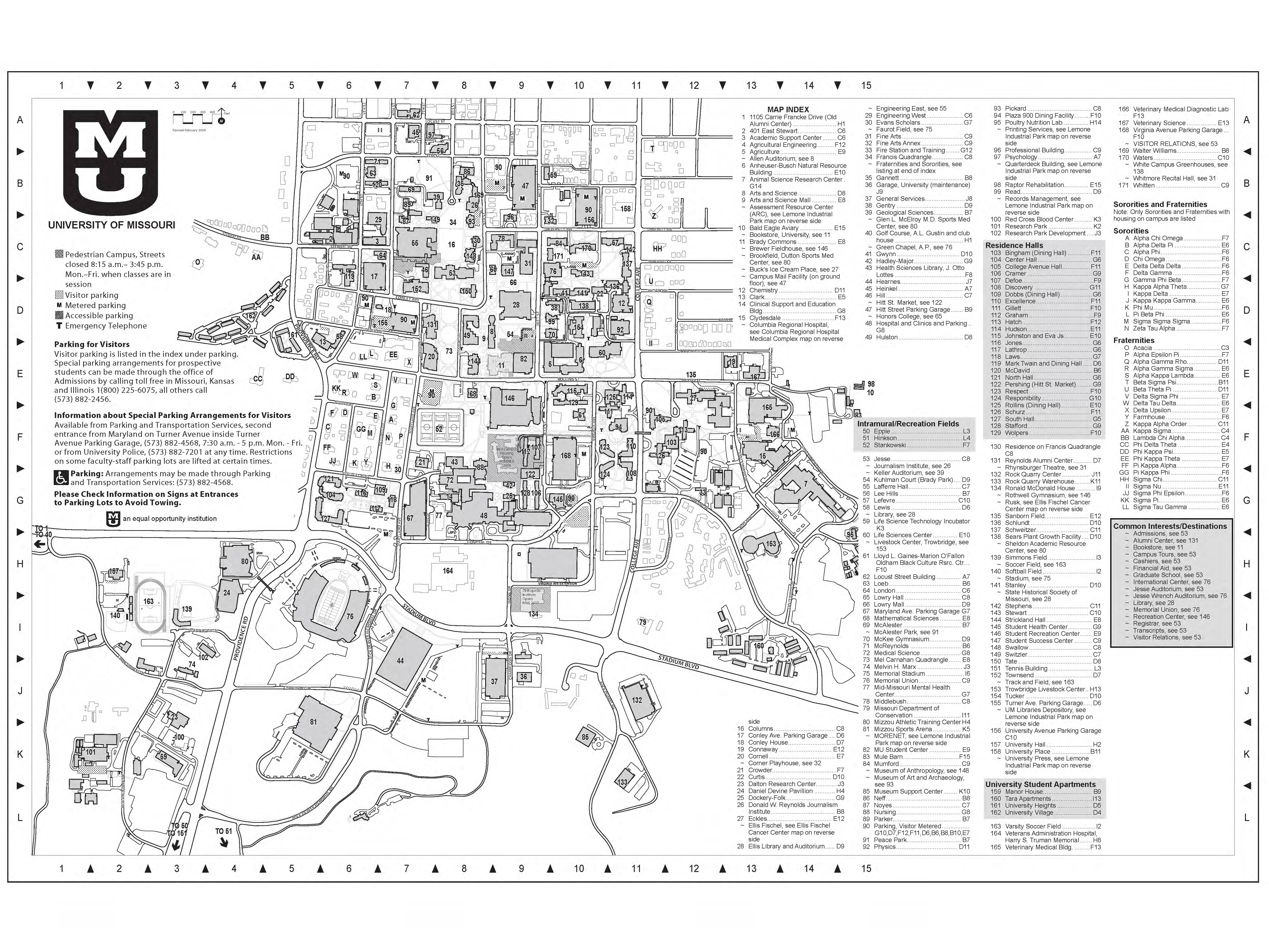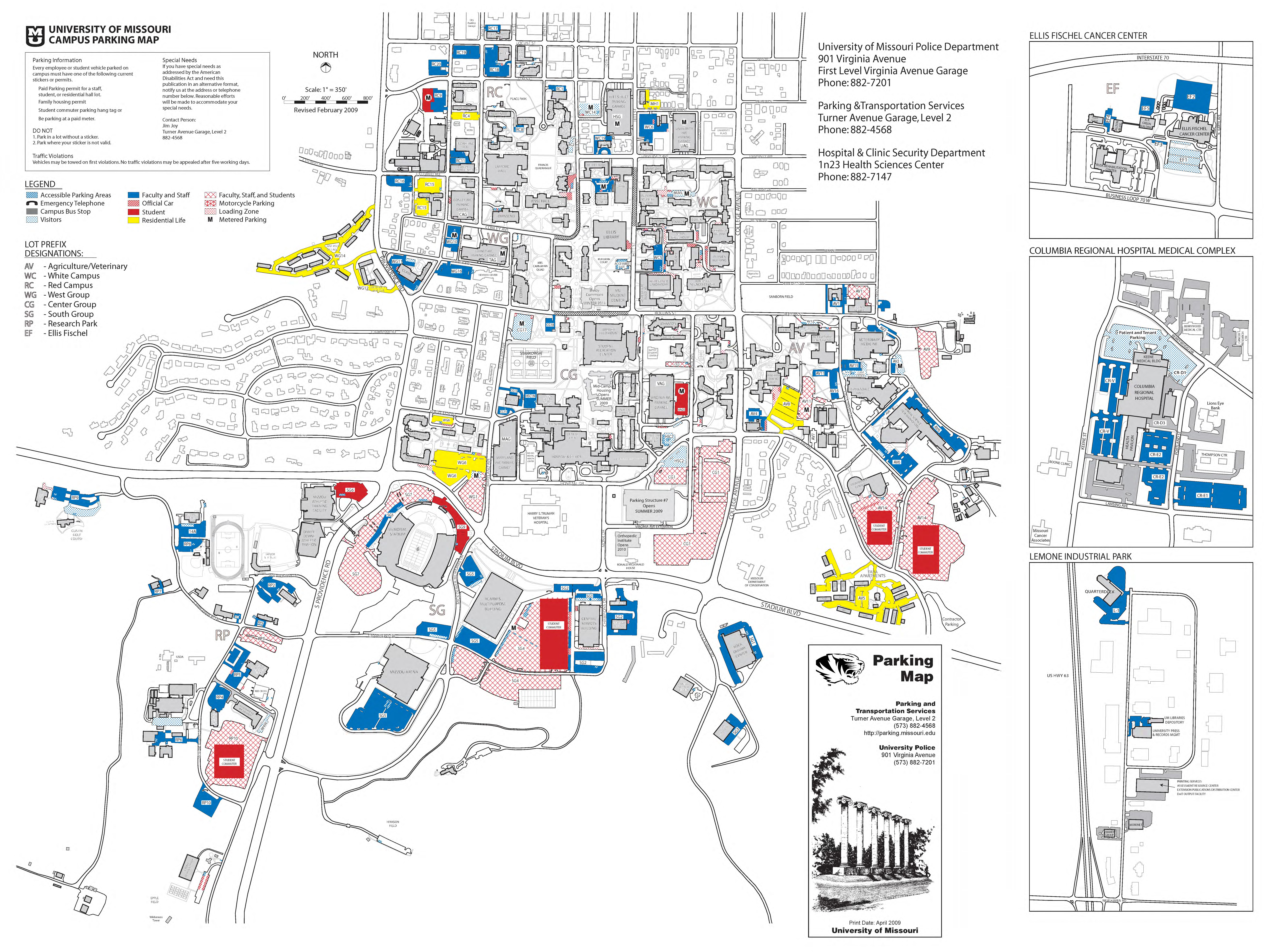 Parking pamphlet containing several maps identifying general locations as well as designated parking areas in and around the University of Missouri--Columbia campus.