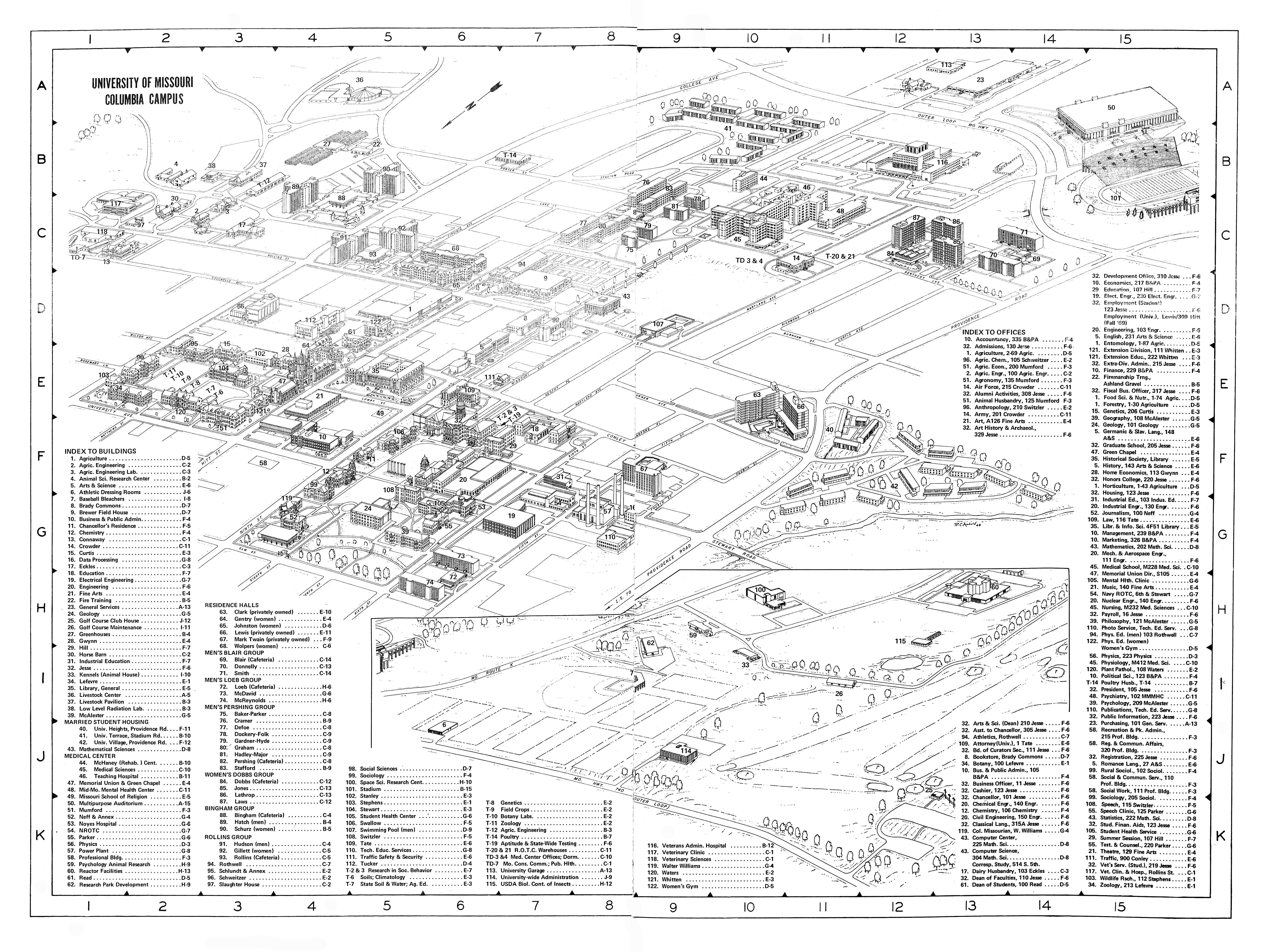 This map shows the locations of buildings on the University of Missouri campus, labeled by number and letter.